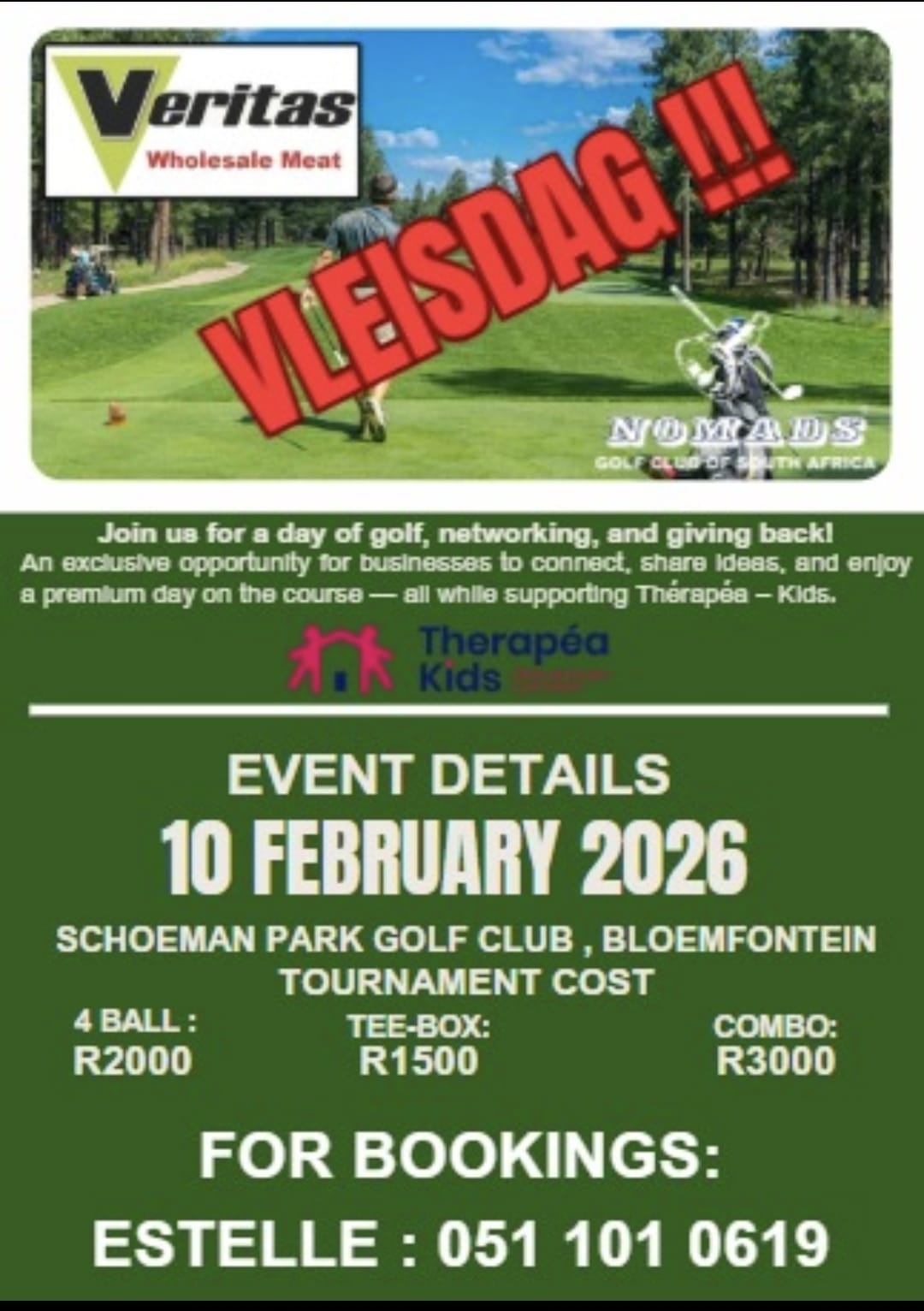 Veritas VleisdagR2000 for 4ballTee-box R1500Combo – R3000+ Add to Google Calendar+ iCal / Outlook export 00days 00hours 00minutes 00seconds DateFeb 10 2026 Time 8:00 am - 6:00 pm LocationSchoemanpark Golf ClubMaselspoort St, Bloemfontein, Free State, 9301 Category Corprate Event Social Events Organizer NomadsShare this event